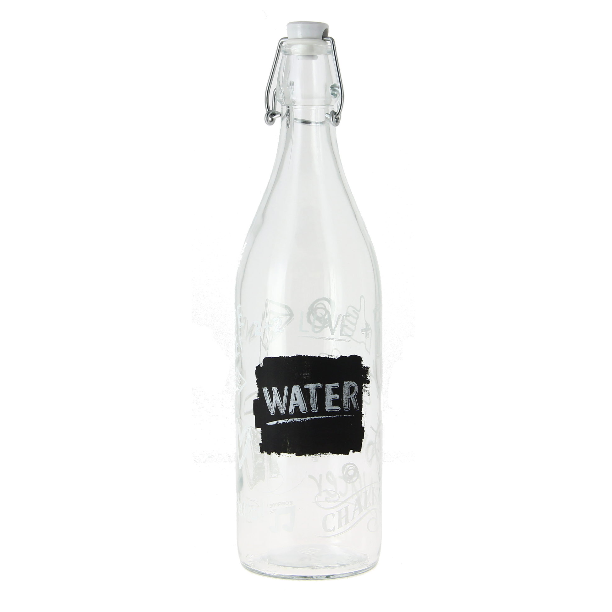 1-Liter-Glasflasche mit Schriftzug und tafelähnlichem Hintergrund, mit Verschluss. Spülmaschinenfest. Hergestellt in Italien.
